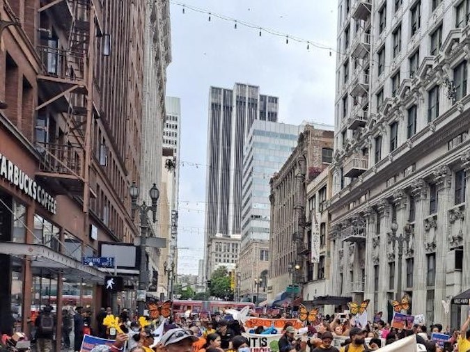 Los marchistas también enfilaron con rumbo al Doubletree Hotel para apoyar a los trabajadores del local 11 del sindicato UNITE Here que demandan salarios dignos y un contrato justo. La marcha terminó en el Ayuntamiento de Los Ángeles.