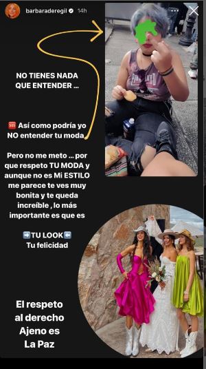 “No tienes nada que entender, así como yo tampoco podría entender tu moda, pero no me meto porque respeto tu moda y aunque no sea mi estilo, me parece que te ves muy bonita y te queda increíble“, respondió Bárbara de Regil para acompañar la imagen que retomó del perfil de su detractora.