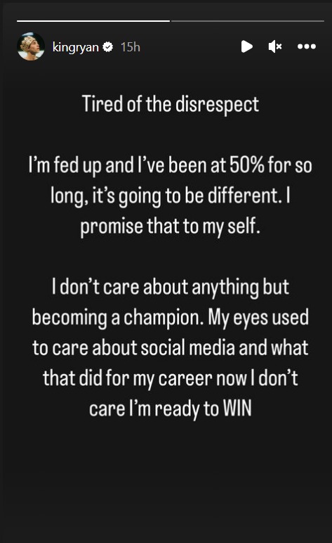 “Honestamente, voy a regresar con venganza. Cansado de la falta de respeto. Estoy harto y llevo tanto tiempo al 50% que será diferente. Me lo prometo a mí mismo”, dijo. “No me importa nada más que convertirme en campeón. Mis ojos solían preocuparse por las redes sociales y lo que eso hizo por mi carrera, ahora no me importa, estoy listo para ganar”, añadió.
