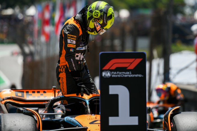 Lando Norris de la escudería McLaren luego de finalizar en el primer puesto de la clasificación para el Sprint de este mismo sábado en Interlagos. (Rudy Carezzevoli/Getty Images)