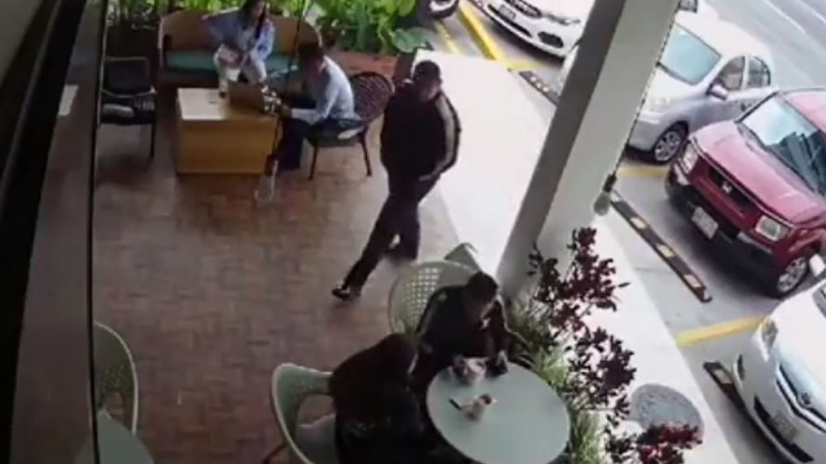 En las imágenes se observa la parte exterior de la cafetería, en la cual hay algunas mesas con dos parejas sentadas en distintos lugares, quienes están tomando café de manera normal cuando un hombre llega y comienza a caminar a la entrada del sitio.