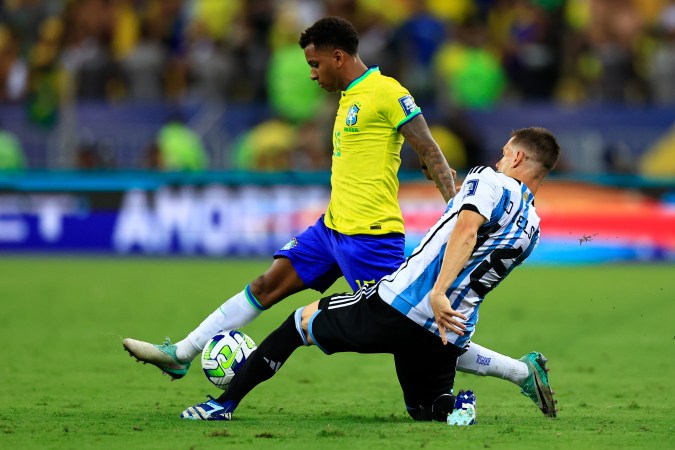 Lionel Messi y Rodrygo tuvieron un cruce antes del partido entre Brasil y Argentina del martes en Río de Janeiro. Crédito: Buda Mendes | Getty Images