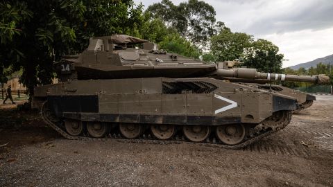 Un tanque Merkava desplegado en un kibutz en la región norte de Kiryat Shmona, cerca de la frontera de Israel con el Líbano. Crédito: FADEL SENNA | AFP / Getty Images