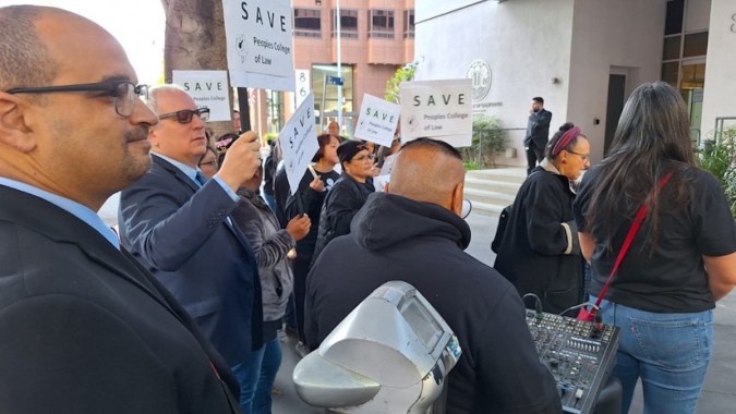 Estudiantes y aliados protestaron contra el cierre de la escuela de leyes The People's of Law College en Los Ángeles. (Cortesía Tessie Borden) Crédito: Cortesía
