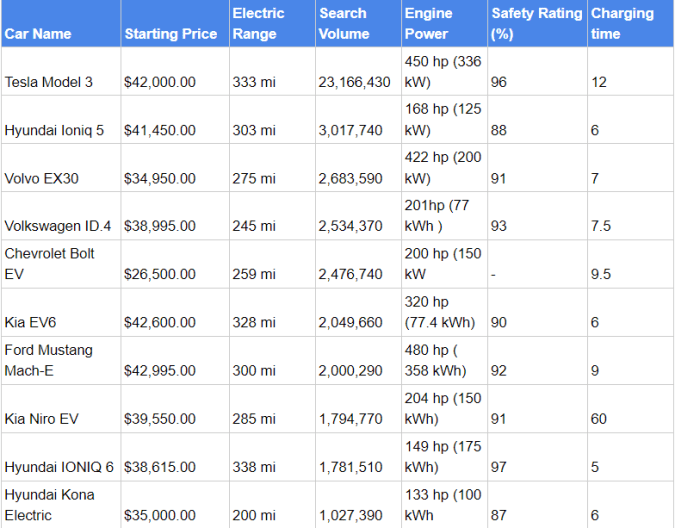 Los datos muestran que los consumidores están claramente interesados en las ofertas de Tesla en el mercado de vehículos eléctricos asequibles. Resulta intrigante observar que, a pesar de no estar disponible en el mercado todavía, el Hyundai IONIQ 6 ha logrado generar cierto interés, como se refleja en la investigación.