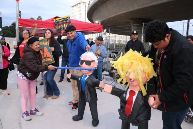 Sobre la acera de la calle Alameda, algunos de ellos utilizaron un palo de escoba para romper las piñatas que tenían la figura de Donald Trump, con su pelo amarillo hecho de tiras de papel picado; mientras que la piñata de Joe Biden llevaba puestas unas gafas oscuras.