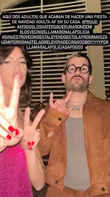 Tras el incidente, Ricky Montaner publicó una foto en sus historias de Instagram en la que aparece junto a su esposa con un breve mensaje de lo ocurrido: “Aquí dos adultos que acaban de hacer una fiesta de Navidad adulta en su casa. Los vecinos llamaron a la policía”.