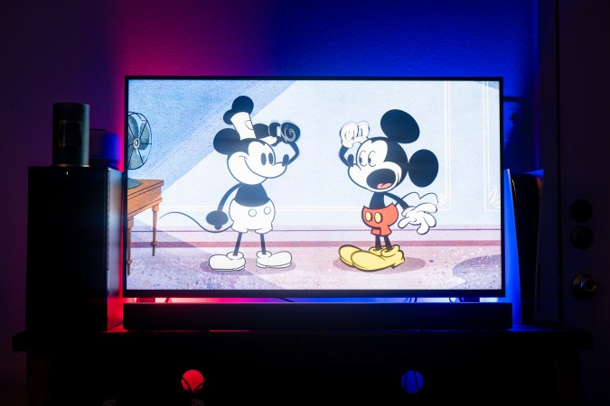 En una ilustración fotográfica, un episodio de Steamboat Willie de Disney que fue el debut de Mickey Mouse se ve en un televisor el 2 de enero de 2024 en Austin, Texas. Crédito: Brandon Bell | Getty Images