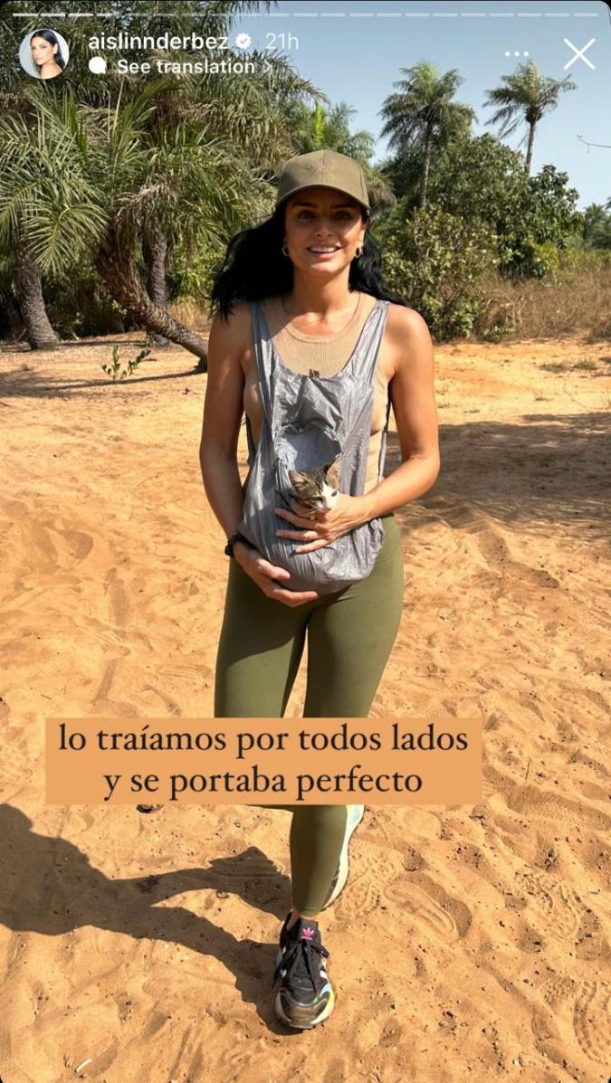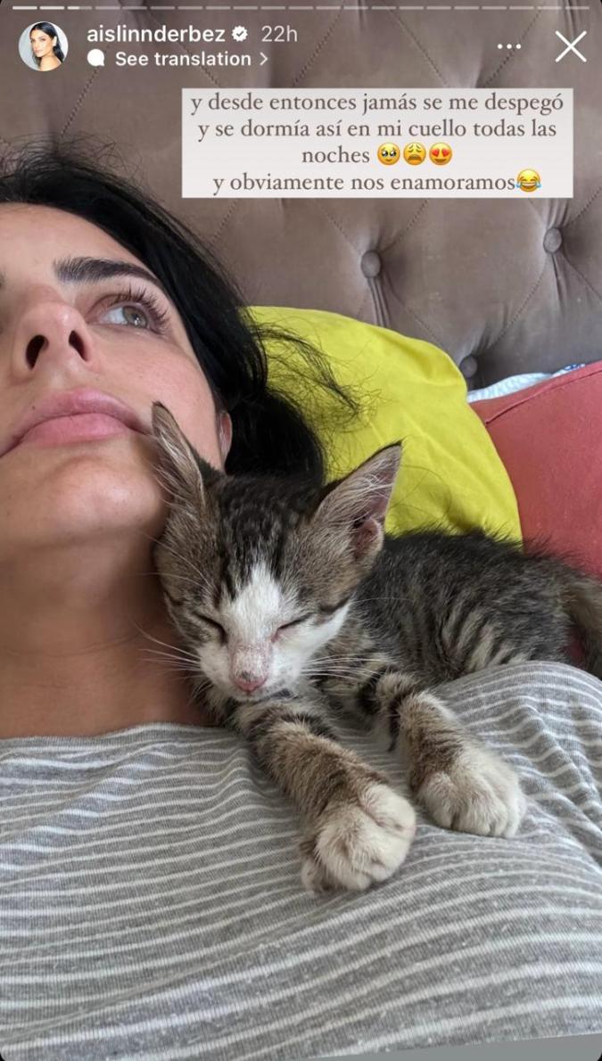Fue desde su perfil oficial en Instagram que la protagonista de “A la mala” y “La Casa de las Flores” mostró a un pequeño gatito que se convirtió en su inesperado compañero de viaje: “Desde entonces jamás se me despegó, y se dormía así en mi cuello todas las noches y obviamente nos enamoramos”, escribió la famosa por medio de sus historias junto a una fotografía donde se aprecia al felino.