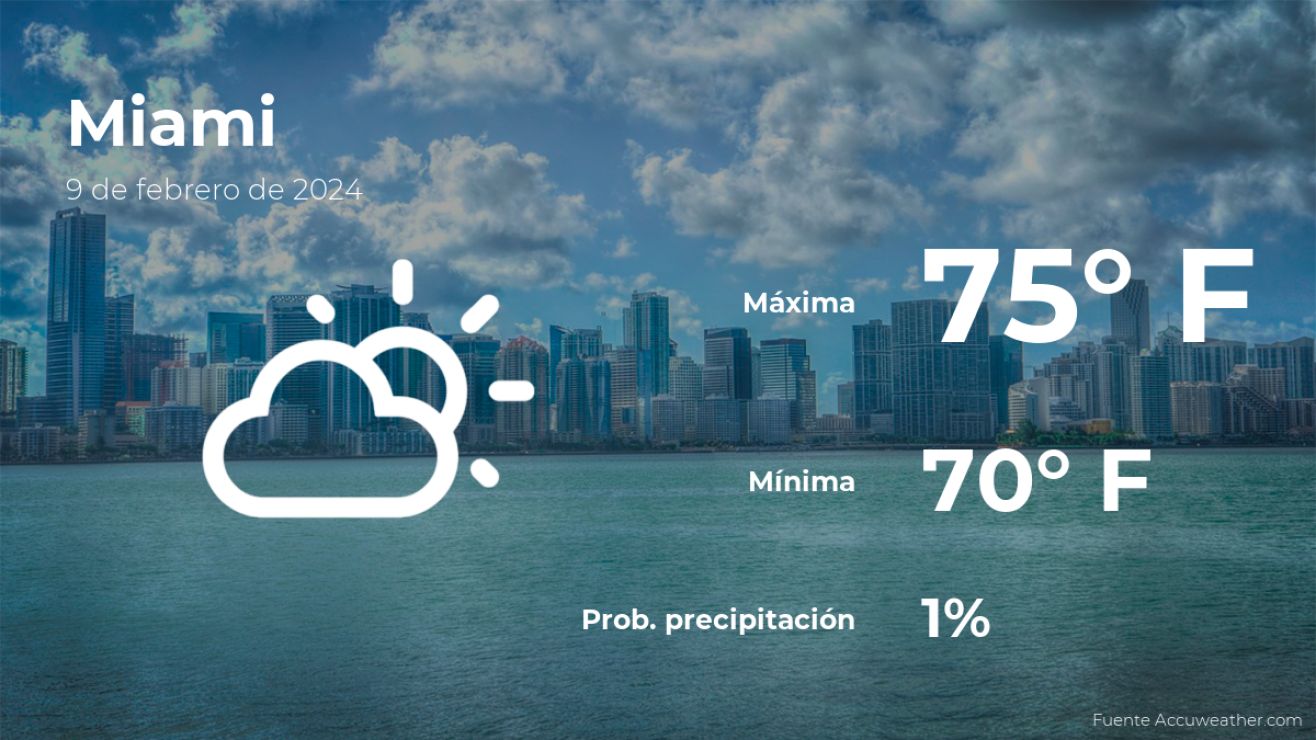 El pronóstico del clima de hoy en Miami para este viernes 9 de febrero indica que los termómetros alcanzarán un máximo de 75 grados Fahrenheit (24ºC) en la ciudad. Por su parte, la probabilidad de lluvia será del 1% y se esperan nubes escasas, mientras que las ráfagas de viento llegarán a las 11.81 mph de máxima en el día y los 9.94 mph por la noche.