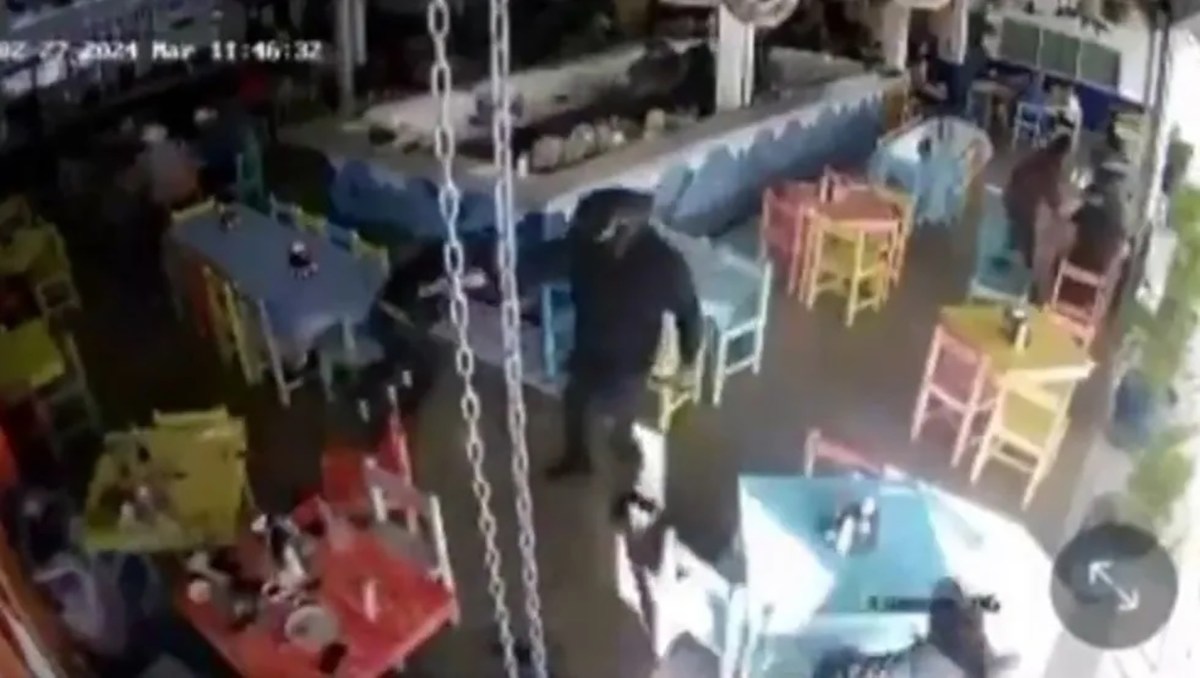 Cuando un grupo de personas departía en una mesa del restaurante, un sujeto vestido de negro y casco de motociclista entra al sitio, saca una pistola y dispara contra ellas, pero solo hiere a uno, mientras el resto del grupo se disipa para ponerse a salvo.