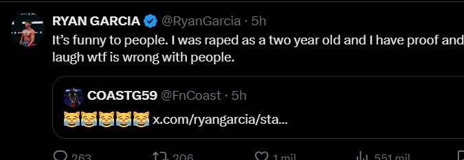El boxeador californiano Ryan García reveló en una publicación en sus redes sociales -un post que fue borrado después- que supuestamente sufrió abuso sexual a los dos años de edad por un miembro de su familia y que tiene pruebas de lo sucedido.
