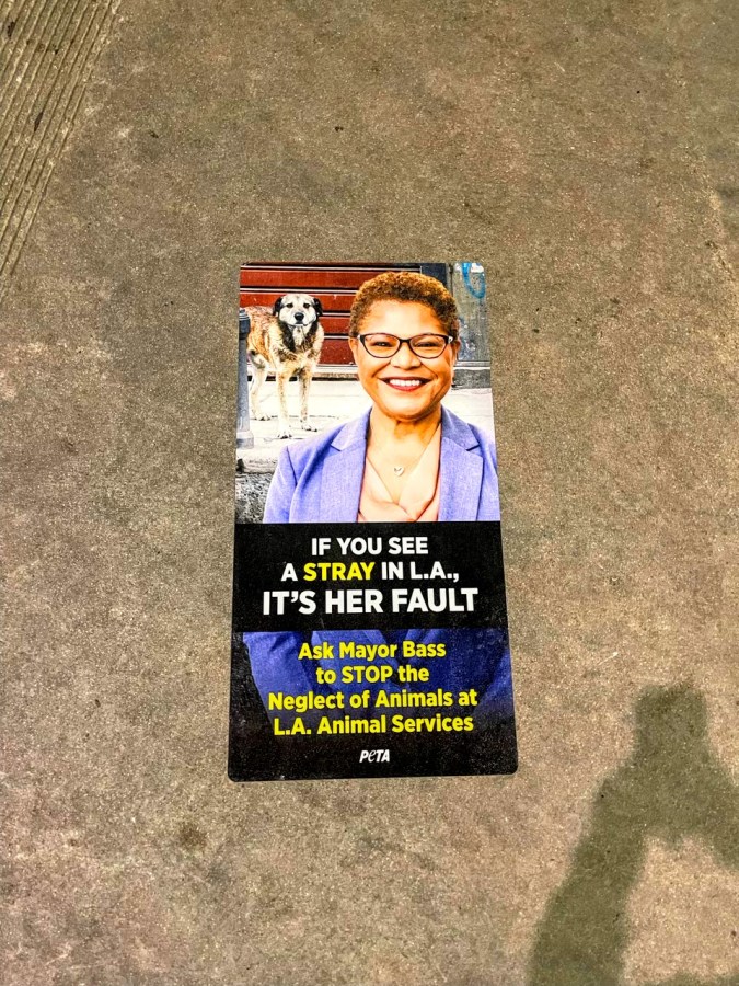 La organización People for the Ethical Treatment for Animals (PETA) lleno de pósters las calles cercanas a la residencia de la alcaldesa de Los Ángeles, Karen Bass, la Getty House, y algunos espacios cercanos al Ayuntamiento y al albergue Chesterfield Square con mensajes que la responsabilizan de la proliferación de animales callejeros y maltrato en los refugios para perros y gatos.