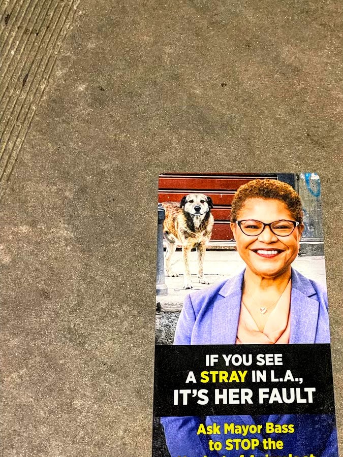 Distribuyen pósters responsabilizando a la alcaldesa Karen Bass de la falta de atención para resolver la crisis de animales callejeros. (Crédito PETA)