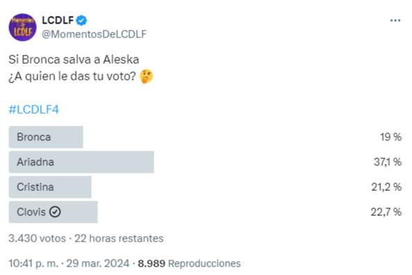 En la cuenta de Instagram de @lcdlf4_vip, la cual tiene más de 30 mil seguidores, afirma que en votaciones Cristina Porta está dominando a Clovis Nienow con 28.5 %. En el último lugar estaría Aleska Génesis.