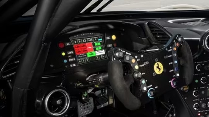 Internamente, el habitáculo del KC23 se ha mantenido tan minimalista y fiel como sea posible al diseño del 488 GT3 Evo 2020, con la excepción de los paneles de las puertas y el acabado del salpicadero en el lado del pasajero.