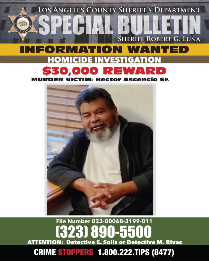 Detectives del Departamento del Alguacil del condado de Los Ángeles, autoridades de gobierno de la ciudad de South Gate y la supervisora del condado, Jaine Hahn, anunciaron una recompensa de $30,000 para dar con el asesino o asesinos del señor Héctor Ascencio, de 57 años.