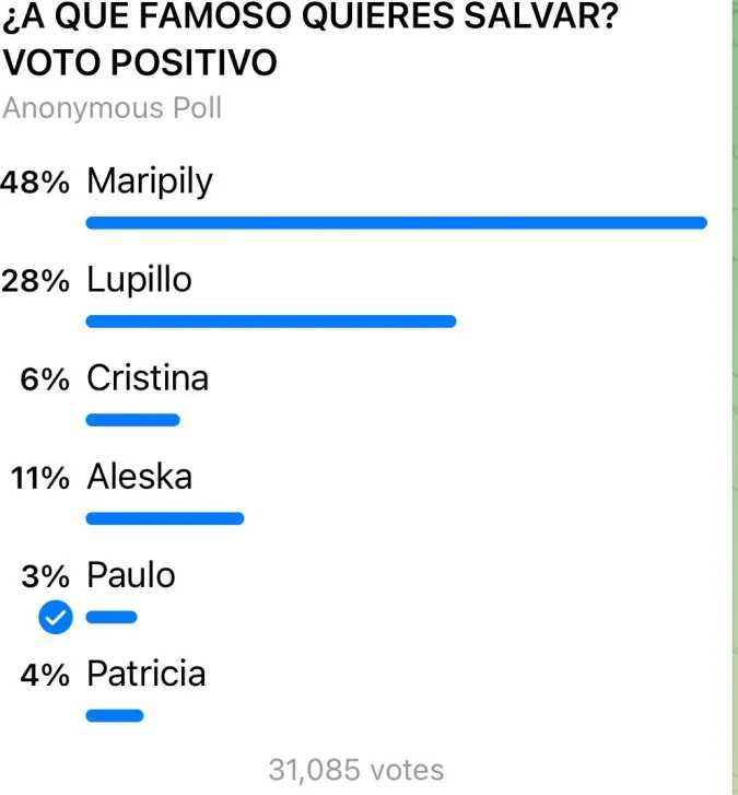 En el día de hoy, las votaciones muestran una tendencia clara después de la salvación de Geraldine Bazán: Paulo y Patricia se encuentran en el último lugar en cuanto a la intención de voto del público hispano.