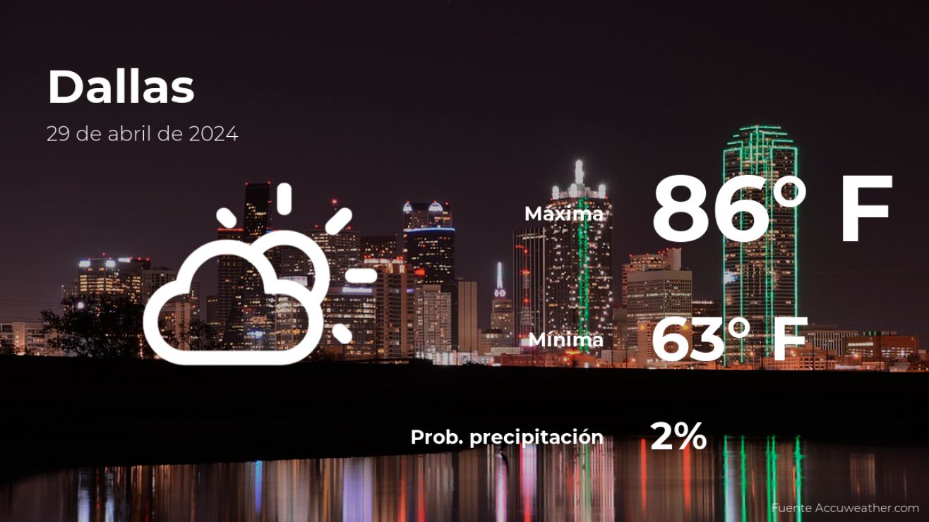 Este lunes 29 de abril se espera que la temperatura en Dallas, Texas, aumente hasta un máximo de 86 grados Fahrenheit (30ºC). La probabilidad de lluvia será del 2% y tendremos escasa nubosidad. Por otro lado, se estiman ráfagas de viento de hasta 4.35 millas por hora.
