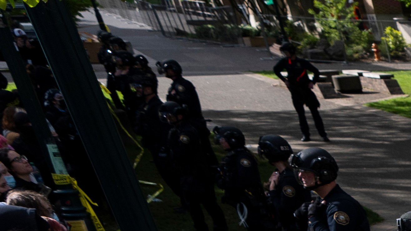 Agentes de policía bloquean un área en el campus de la Universidad Estatal de Portland, en Portland, Oregon. Crédito: Jenny Kane | AP