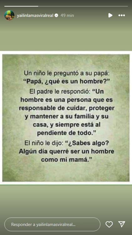 “Un niño le preguntó a su papá: ‘Papá, ¿qué es un hombre?’. El padre respondió: ‘Un hombre es una persona que es responsable de cuidar, proteger y mantener a su familia y su casa, y siempre está al pendiente de todo’. El niño le dijo: ‘¿Sabes algo? Algún día querré ser un hombre como mi mamá’”, decía el mensaje que compartió Yailin.
