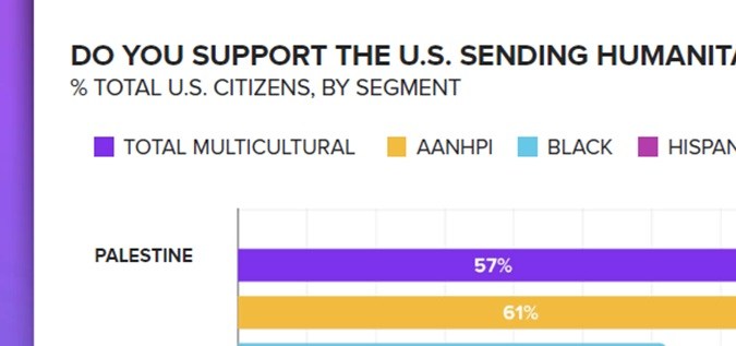 Las opiniones se centran en ayudar en forma humanitaria a Palestina con 57% de todos los votantes de poblaciones diversas; el 59% de los latinos tiene esa opinión, pero es la población LGBTQIA+ la más enfática con 69%.