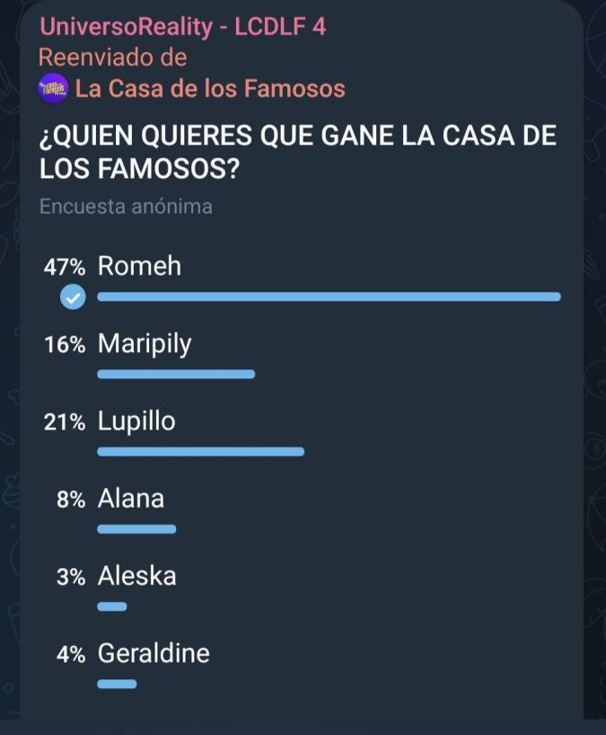 Por otro lado, Universo Reality, una comunidad de fans en Telegram, maneja los siguientes porcentajes: