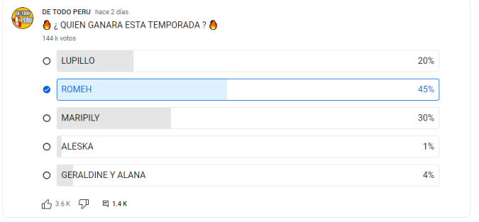 De acuerdo a la encuesta de ‘De Todo Perú’, comunidad que acumula más de 270 mil suscriptores, la persona que está liderando es Rodrigo Romeh. El influencer mexicano acumula 45 % de los votos.