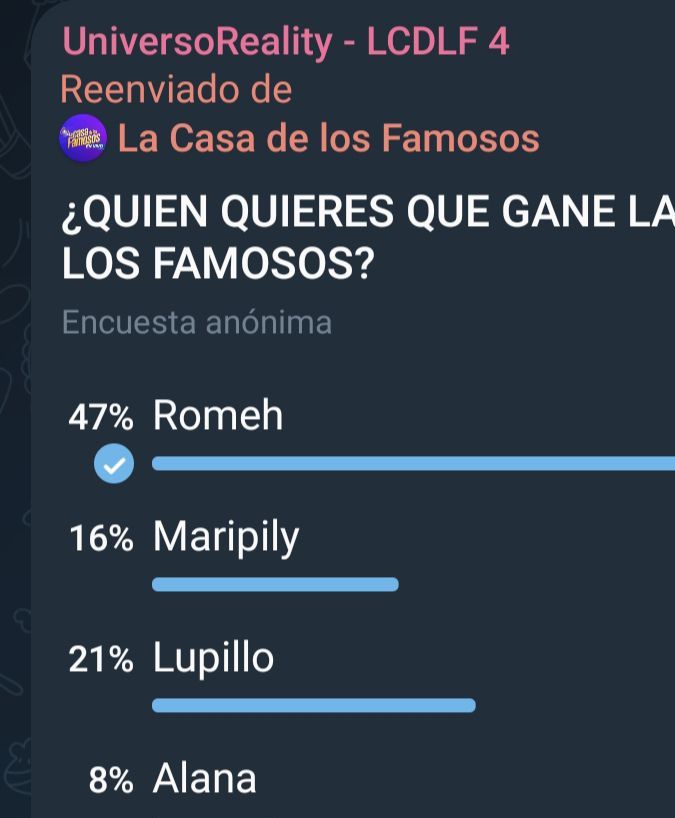 Por otro lado, Universo Reality, una comunidad de fans en Telegram, maneja los siguientes porcentajes: