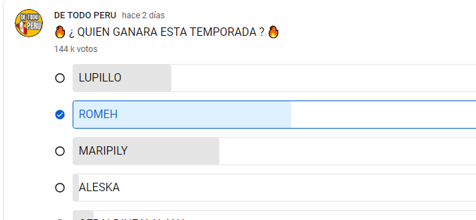 De acuerdo a la encuesta de ‘De Todo Perú’, comunidad que acumula más de 270 mil suscriptores, la persona que está liderando es Rodrigo Romeh. El influencer mexicano acumula 45 % de los votos.