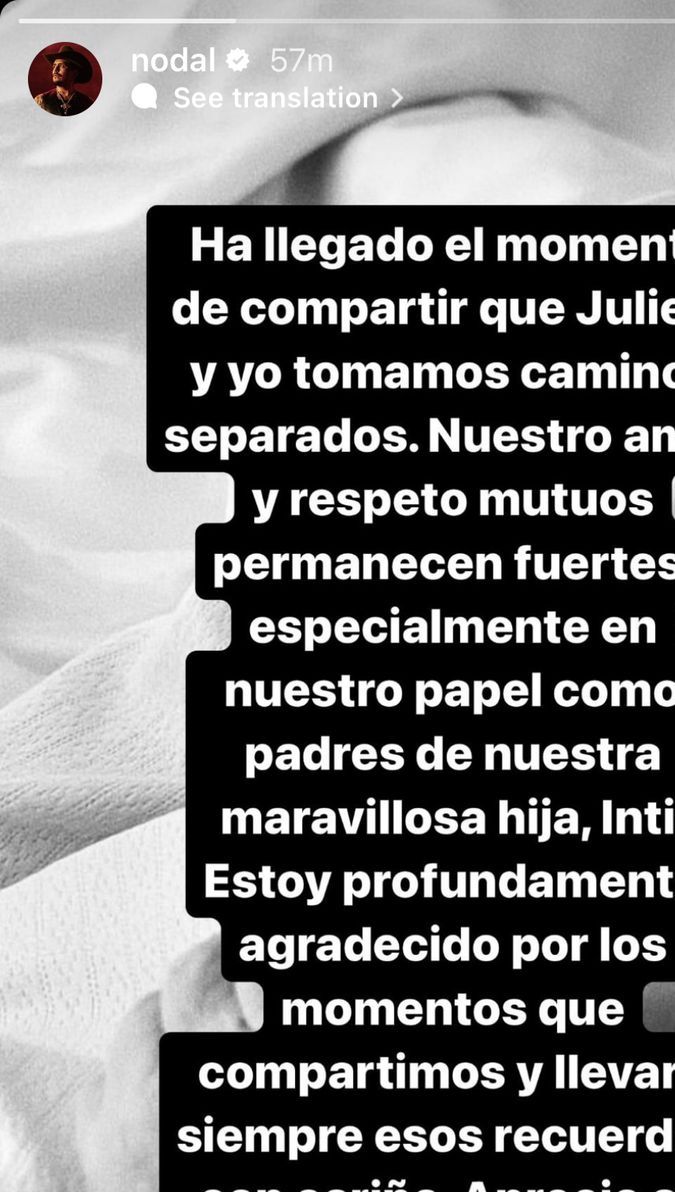 Ha llegado el momento de compartir que Julieta y yo tomamos caminos separados“, explicó el famoso por medio de una historia. “Nuestro amor y respeto mutuos permanecen fuertes, especialmente en nuestro papel como padres de nuestra maravillosa hija, Inti“.