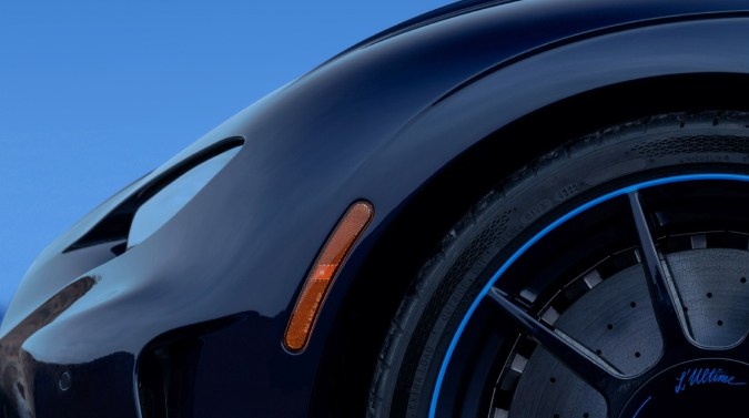 En homenaje al último Chiron, el número ‘500’, escrito a mano y visible en el exterior, las tapas de las ruedas y el alerón trasero, también está grabado en la cubierta del motor que alberga el tren motriz Bugatti W16.