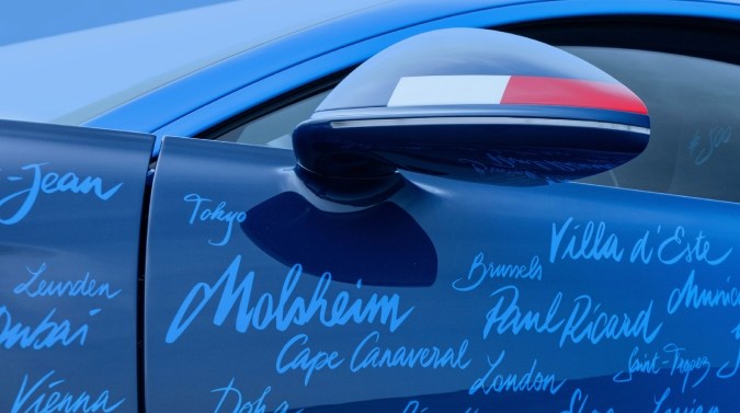 Ahora, para este Chiron número 500 y final, el equipo de Bugatti Sur Mesure ha reinventado el diseño original con una combinación de colores desvanecidos y un tributo a todos los lugares donde el auto ha dejado su huella desde 2016.