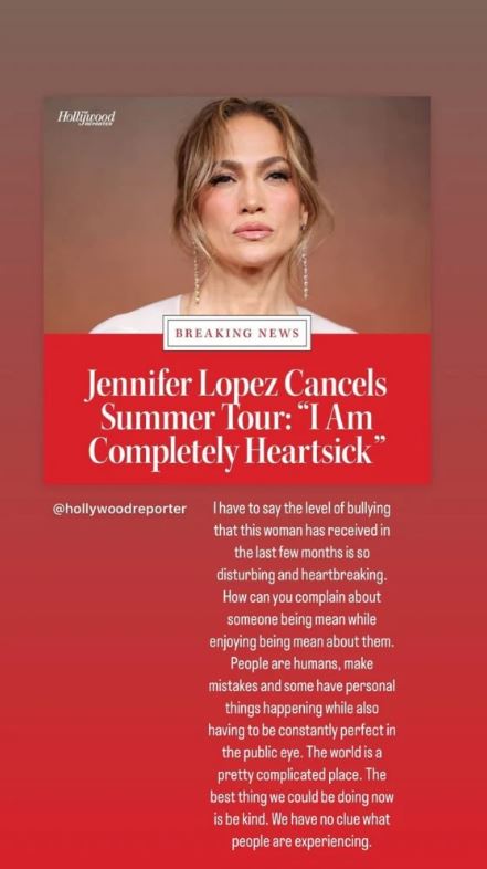 La notica de la cancelación de la gira también llega después de que esta semana se especulara sobre que las negociaciones de JLo para realizar una residencia en Las Vegas estaban en peligro debido a las bajas ventas de boletos para sus shows.