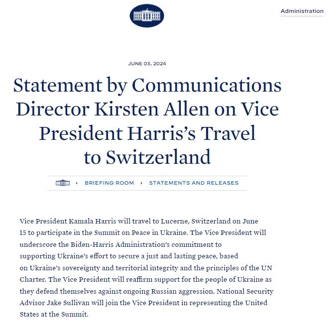 Para esta reunión, a la que fueron invitadas delegaciones de 160 países, menos Rusia, la Casa Blanca anunció que Harris acudirá a la cita en Lucerna el 15 y el 16 de junio.