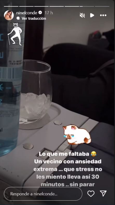 Esta semana, Conde compartió en sus historias de Instagram un video en el que se veía a un pasajero, notablemente nervioso, que movía mucho su pierna. “Lo que me faltaba, un vecino con ansiedad extrema… qué estrés, no les miento, lleva así 30 minutos sin parar”, escribió la cantante junto a la publicación.