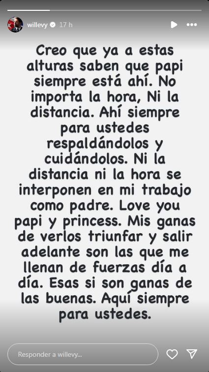 “Creo que ya a estas alturas saben que papi siempre está ahí. No importa la hora, ni la distancia. Ahí siempre para ustedes respaldándolos y cuidándolos. Ni la distancia ni la hora se interponen en mi trabajo como padre”, comienza Levy su mensaje.