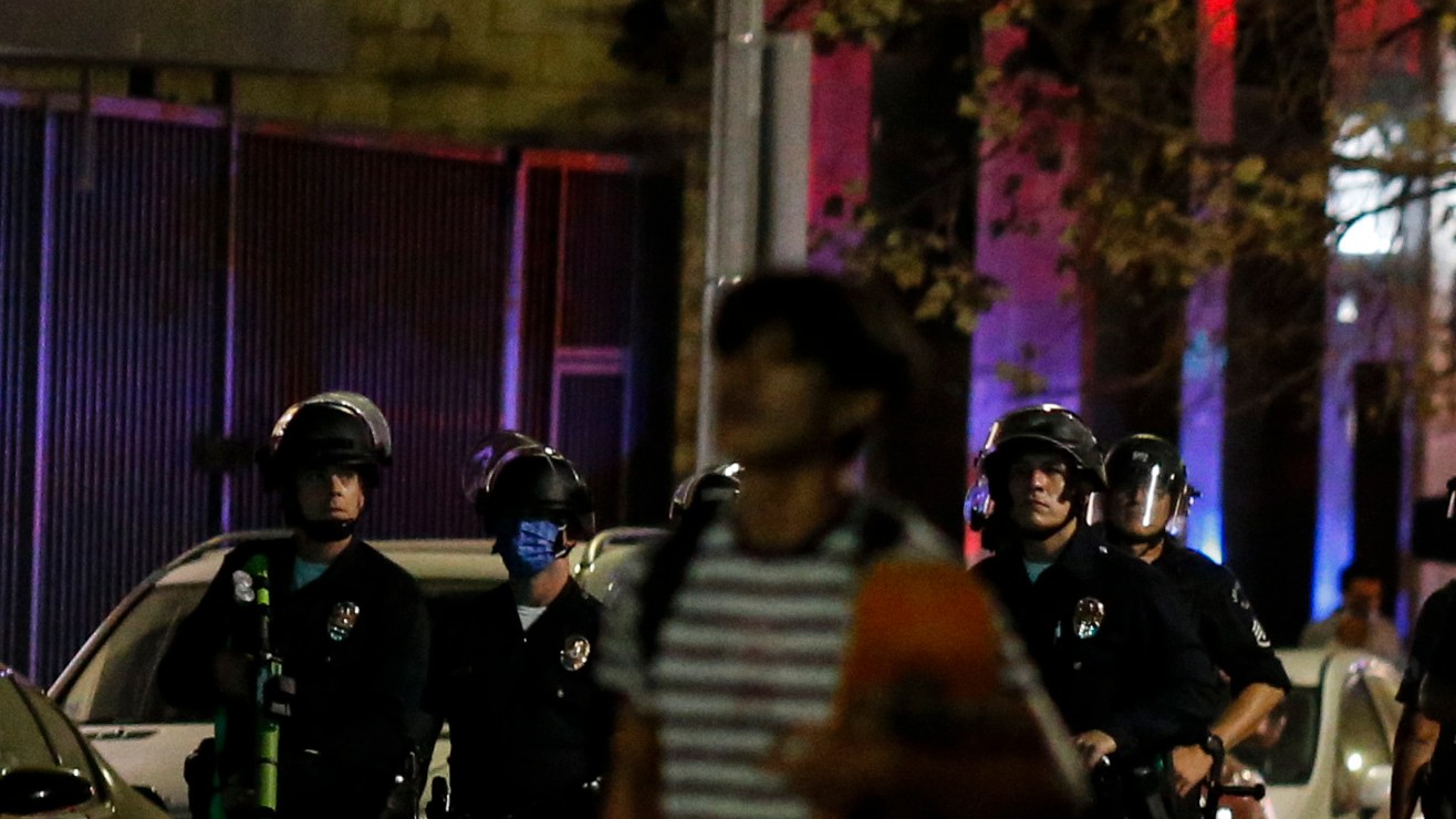 Police officers stand guard as they clear the streets during a protest in Los Angeles, Wednesday, Nov. 4, 2020, following Tuesday's election. (AP Photo/Ringo H.W. Chiu)
