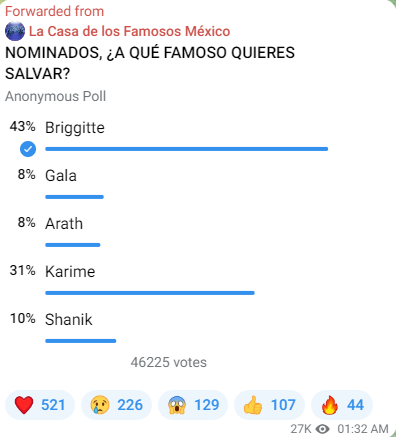 Según Universo Reality, una cuenta de Telegram dedicada a hablar de reality shows, Bozzo lleva la delantera con 43 % de aceptación, le sigue Karime con 31 %, en el tercer puesto está Shanik con 11 % y en el cuarto lugar están empatados Gala Montes y Arath De La Torre.