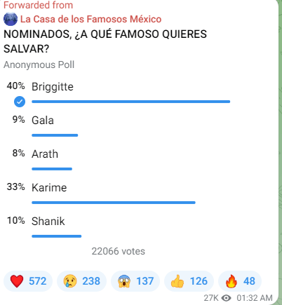 En la encuesta de Universo Reality, una cuenta dedicada a programas de telerrealidad, Karime lleva la delantera, con 33 %, le sigue Shanik con 10 %, Gala Montes con 9 % y Arath con 8 %.