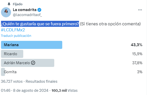 En la consulta de ‘La Comadrita’, la pregunta es “¿Quién te gustaría que se fuera primero?”, en este orden: La primera persona que está es Mariana Echeverría, la misma acumula 43, 4 %, después le sigue Adrián Marcelo con 37,8 %, en el tercer puesto se encuentra Ricardo Peralta y en el último ‘Gomita’.