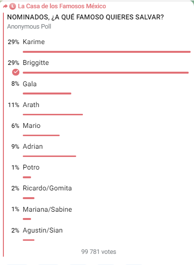 De acuerdo a Universo Reality, una cuenta de Telegram dedicada a los realities show, Karime Pindter es quien lidera las votaciones, al igual que Briggitte Bozzo. Ambas están igualadas con 29 % de aceptación.