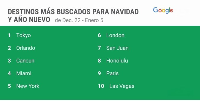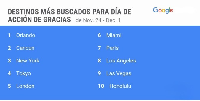 Durante el feriado de Acción de Gracias, los viajeros buscan destinos tanto nacionales como internacionales. Entre los destinos más solicitados según Google Flights destacan: