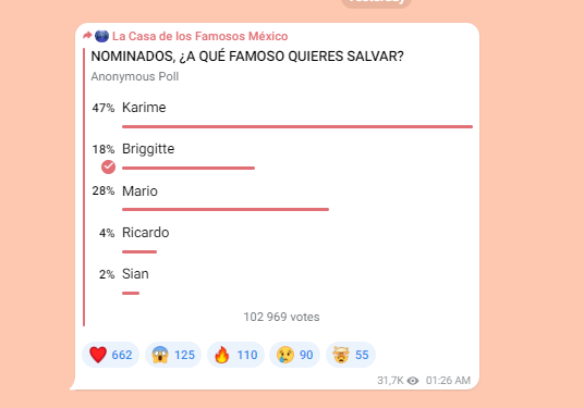 Este viernes, 6 de septiembre, las votaciones continúan abiertas. De acuerdo a ‘Universo Reality’, una cuenta dedicada al seguimiento del reality show, Karime Pindter es quien mantiene el liderazgo.