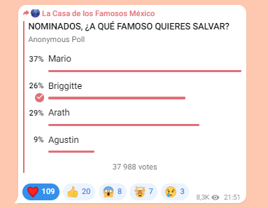 Universo Reality, una cuenta de Telegram que se ha convertido en una referencia en el reality show, posiciona a Mario Bazares en la cima con 38 % de los votos, en el segundo puesto está Arath de la Torre con 27 % y muy de cerca está Briggitte Bozzo con 26 %.