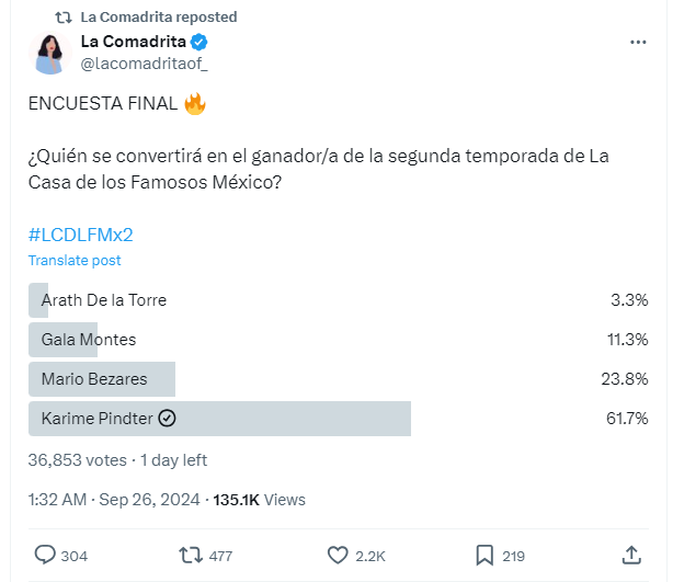 En la recta final, las votaciones en ‘La Casa de los Famosos México’ están reñidas. De acuerdo a la consulta de ‘La Comadrita’, una cuenta en X, Karime Pindter lleva la delantera, en el segundo puesto está Mario Bezares, en el tercer puesto está Gala Montes y en el cuarto lugar Arath de la Torre.