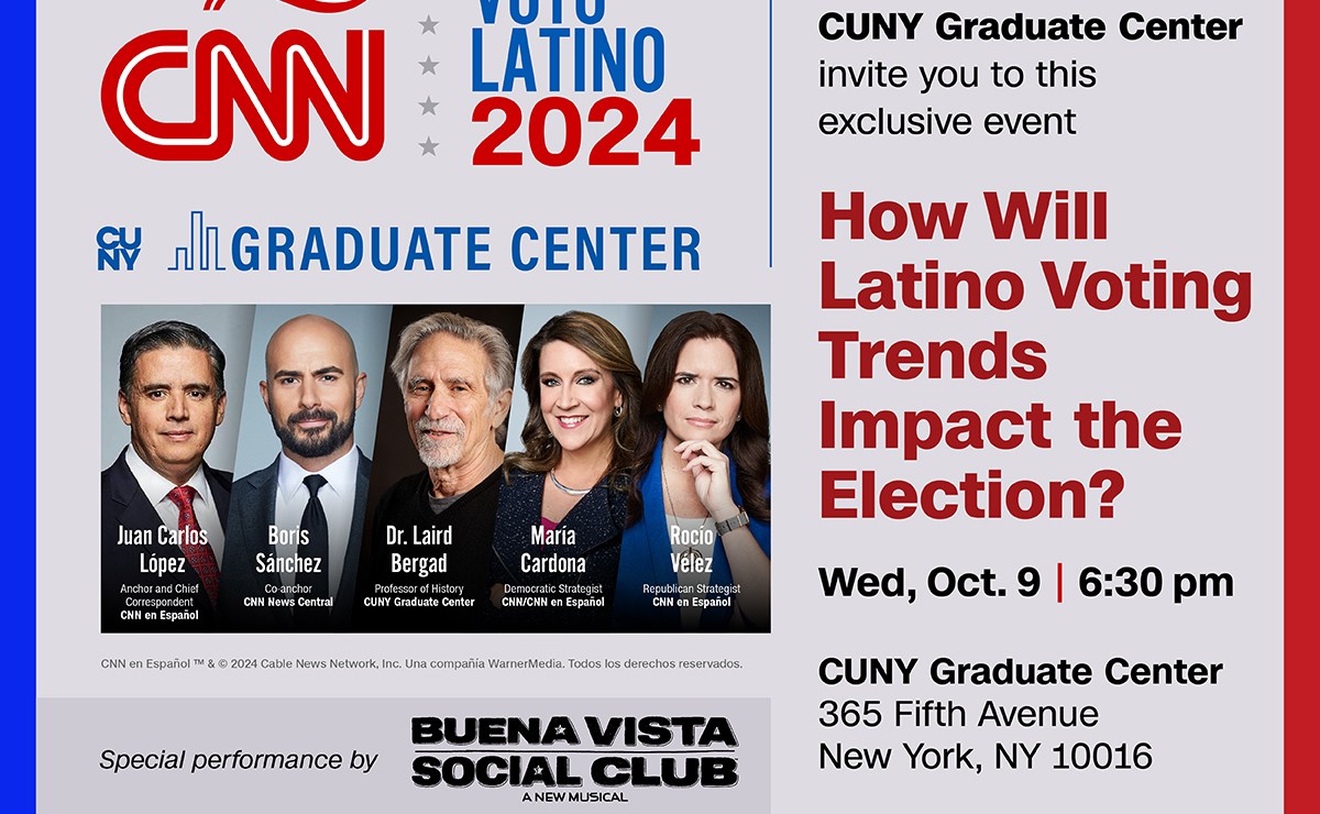 CNN en Español y el Centro de Estudios Latinoamericanos, Caribeños y Latinos de la Universidad de la Ciudad de Nueva York (CUNY, por sus siglas en inglés) se unen para presentar un evento sobre la importancia del voto latino en las próximas elecciones presidenciales de Estados Unidos, el miércoles 9 de octubre a las 6:30 p.m. ET. en el Graduate Center de esa casa de estudios.