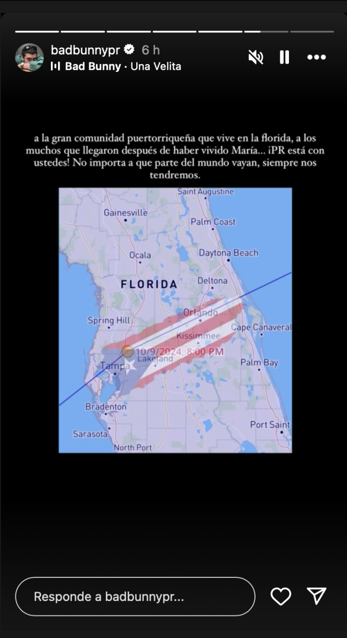 Milton, que se estima causará estragos en varias regiones del estado de la Florida, pasará por zonas como Tampa, Orlando, Sarasota y otras ciudades del estado. El artista, de 30 años, publicó una imagen que muestra las áreas que estarán afectadas por Milton, enfatizando su preocupación por la comunidad boricua que reside en esas localidades.