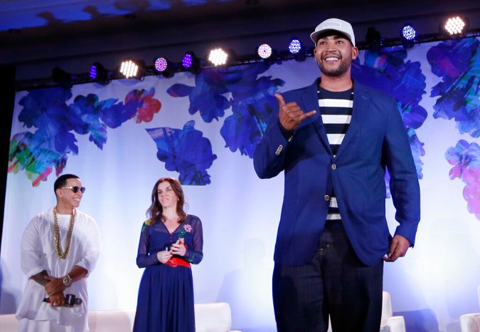 El cantante puertorriqueño Daddy Yankee, a la derecha, conversa con la presentadora Leila Cobo durante un panel en la Semana de la Música Latina de Billboard, en Miami Beach, Florida, Crédito: Wilfredo Lee | AP