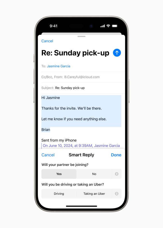 En la aplicación Mail, Apple Intelligence destaca los mensajes más importantes y ofrece resúmenes concisos en la bandeja de entrada o en hilos específicos, brindando una visión rápida de cada correo electrónico. Smart Reply ayuda a los usuarios a responder rápidamente y pasar a otras tareas.